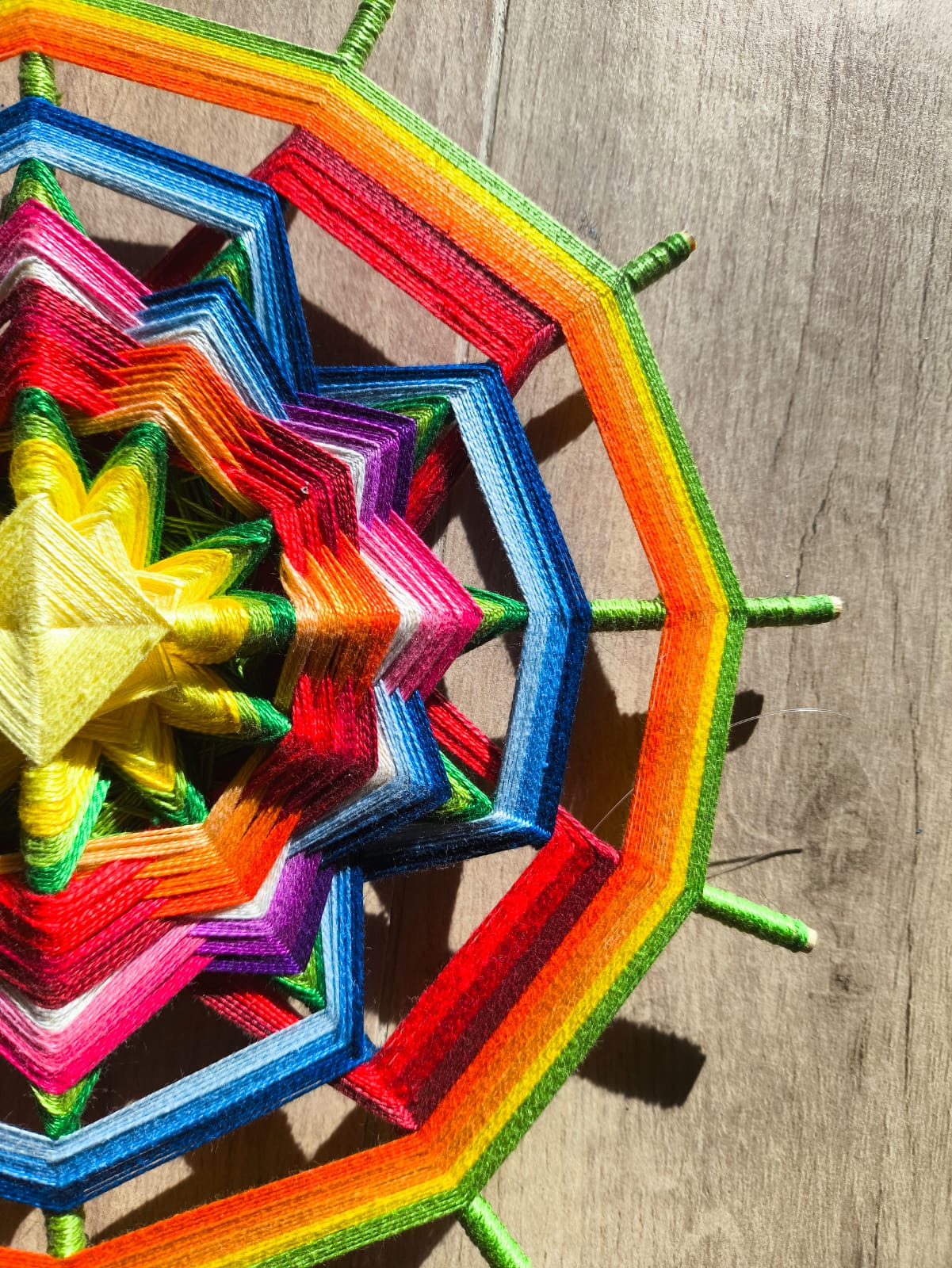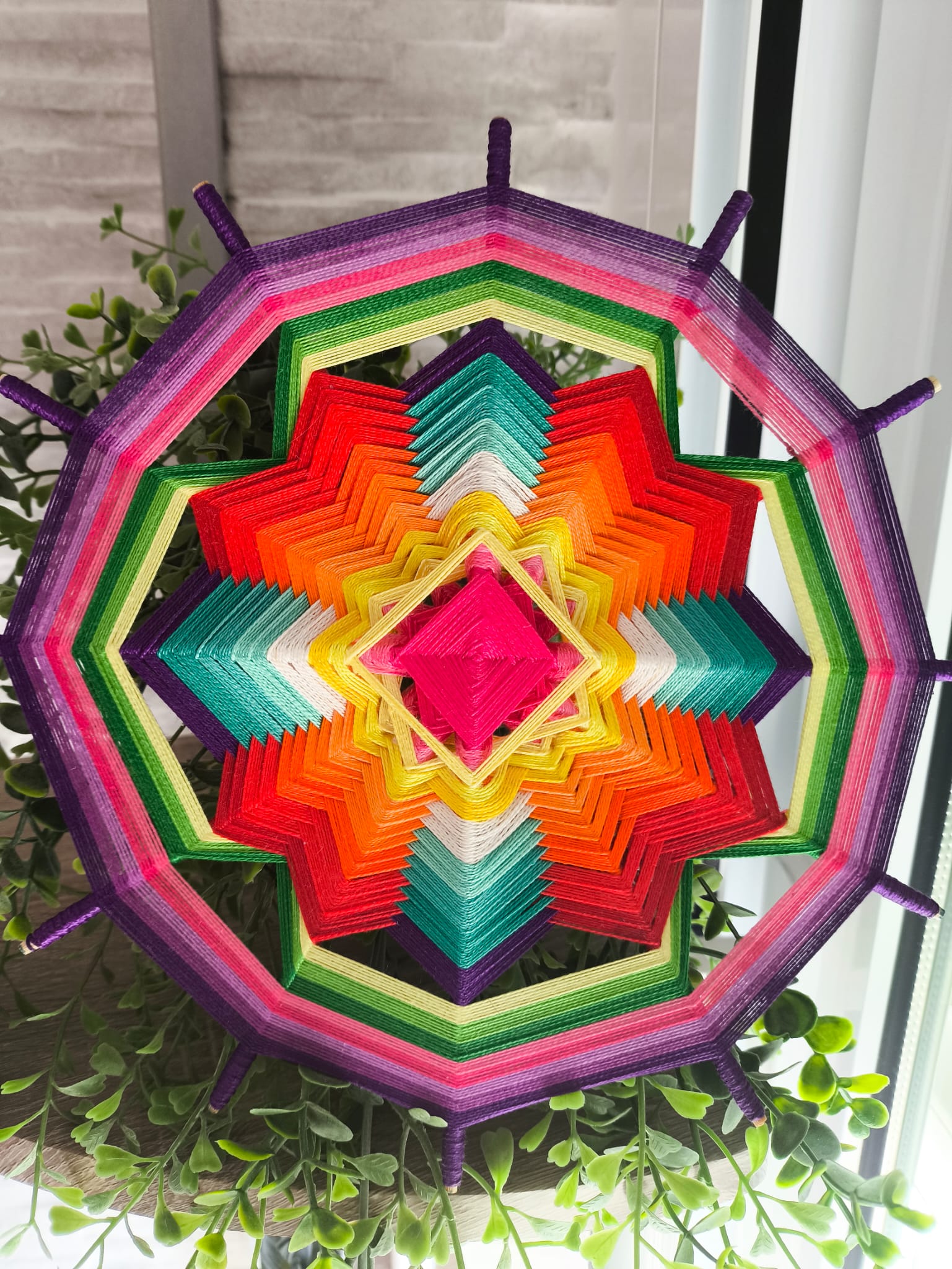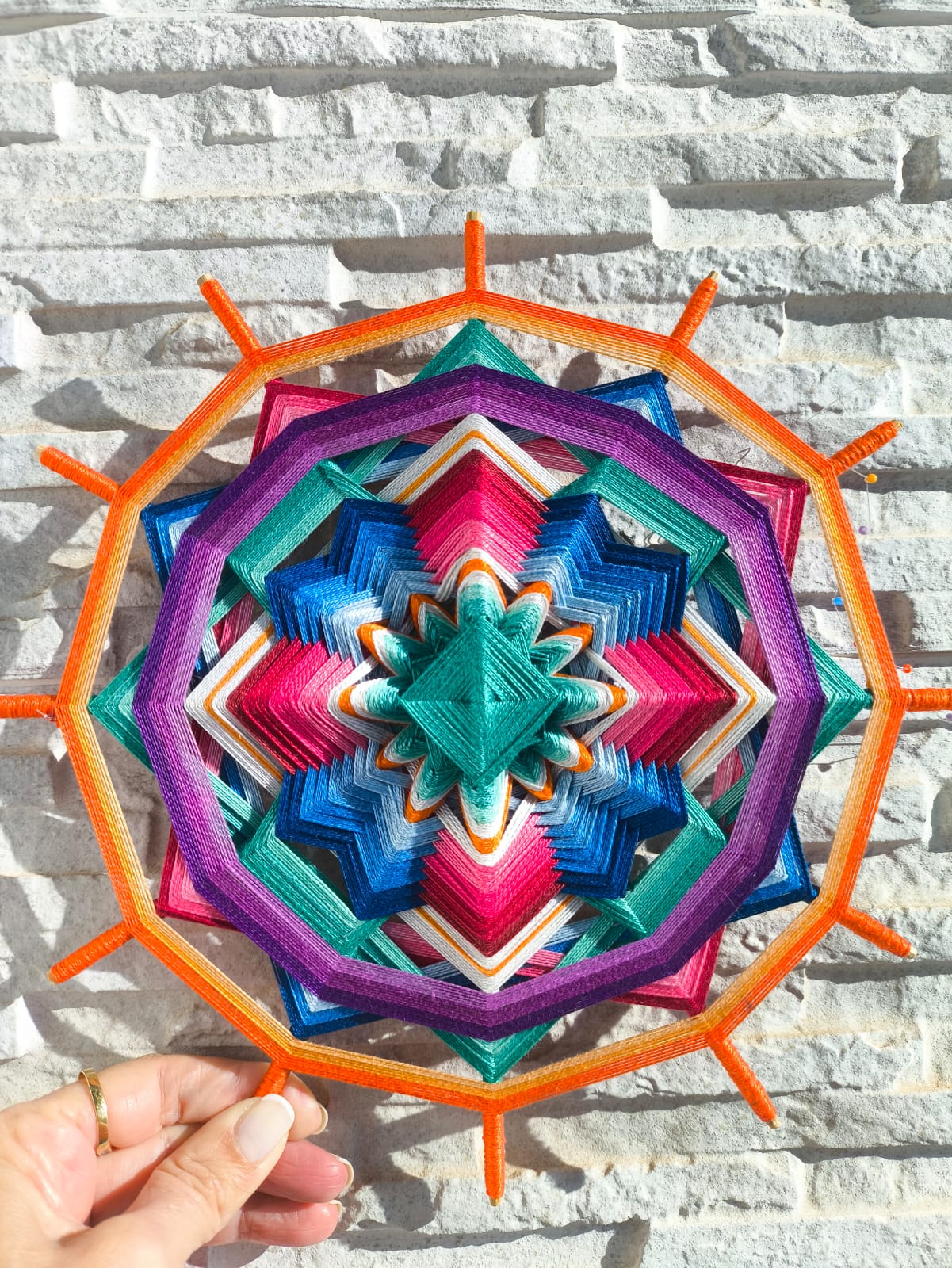 Todos los mandalas son piezas únicas, tejidos a mano con hilos de colores intensos y cuentas decorativas para colgar.