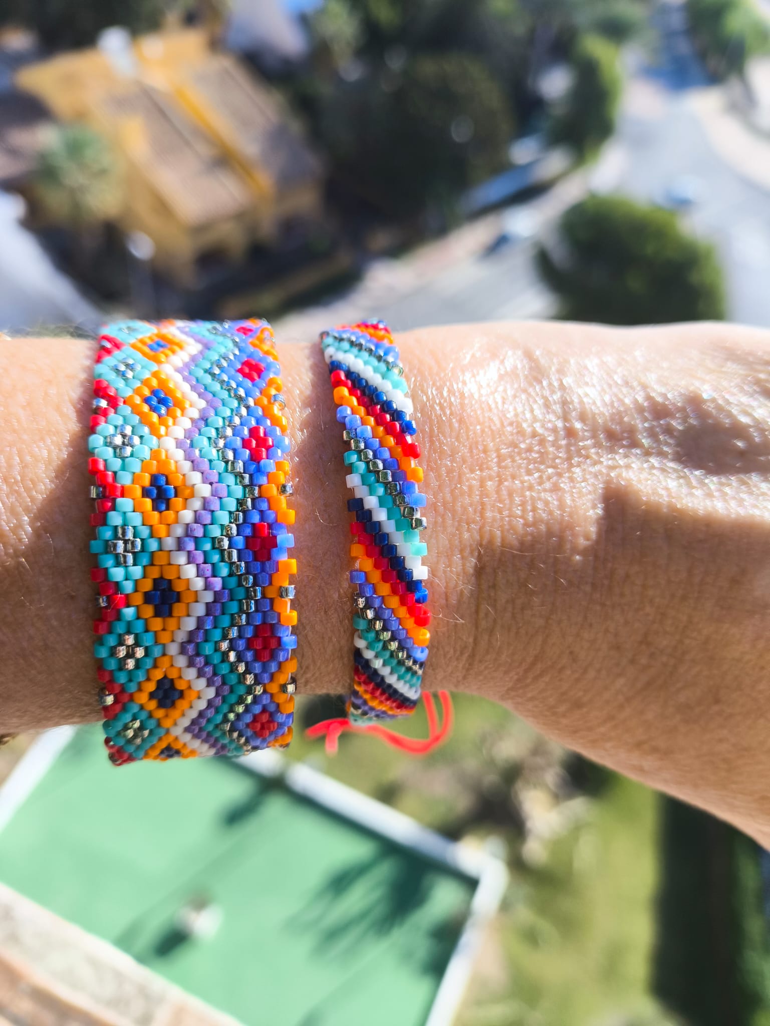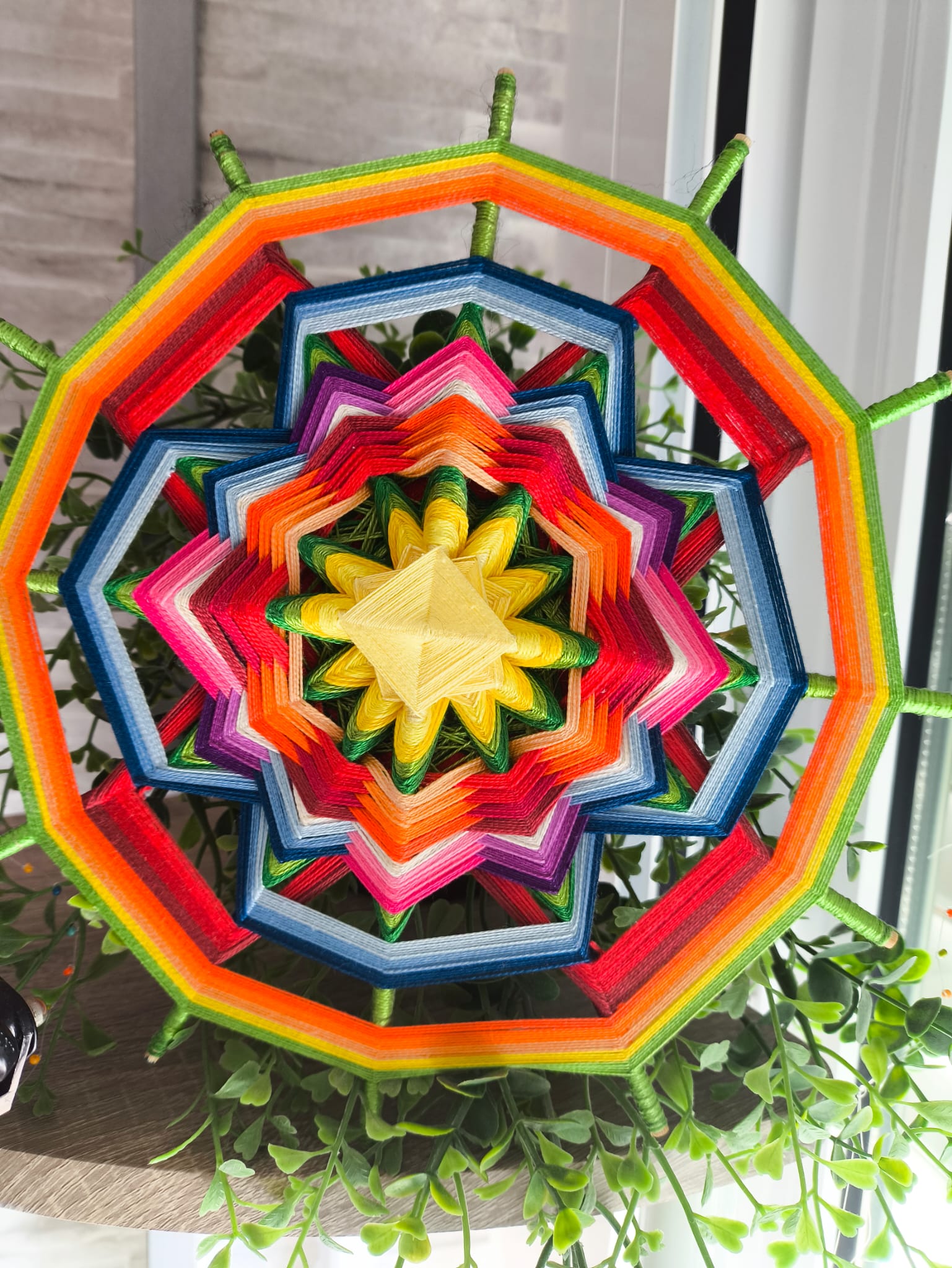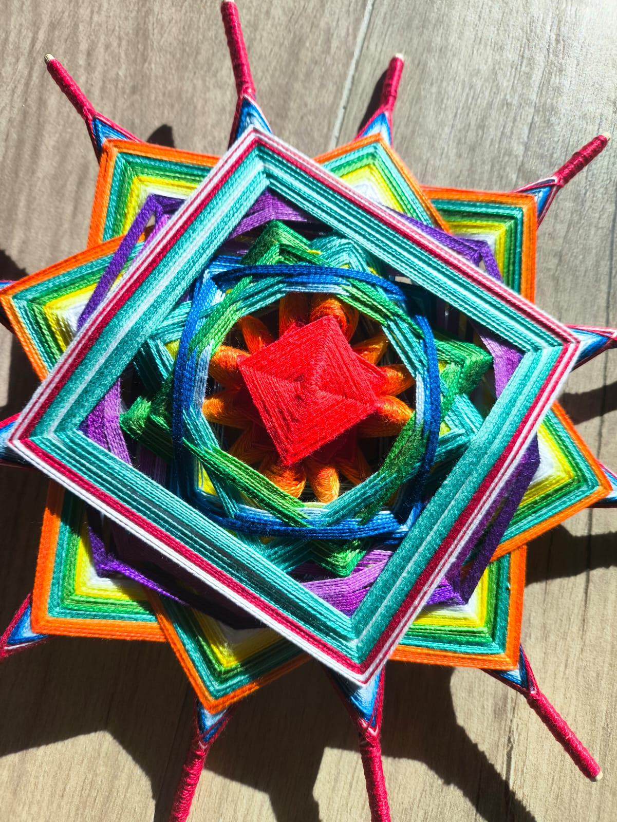 Todos los mandalas son piezas únicas, tejidos a mano con hilos de colores intensos y cuentas decorativas para colgar.